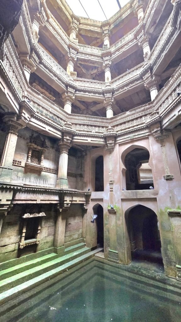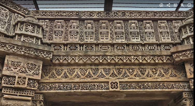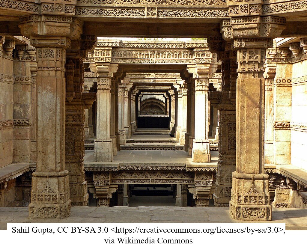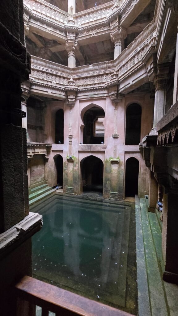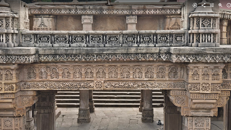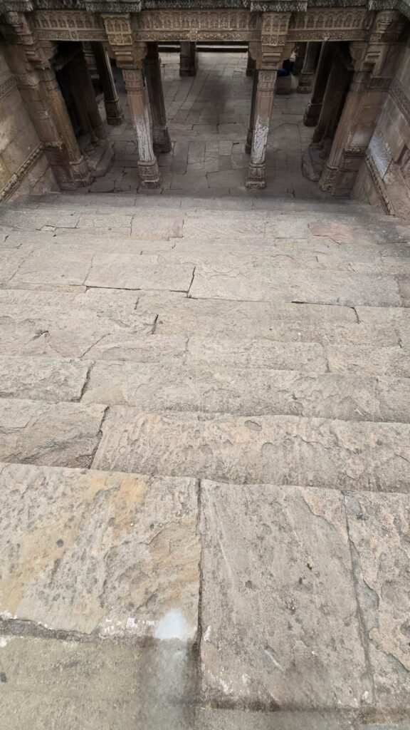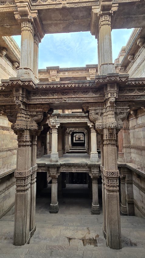 हमारा पहला पड़ाव था “अडालज की वाव” । वाव या बावड़ी या, अंग्रेज़ी में, Stepwell, का इतिहास बहुत पुराना है । पानी को संचय करनेवाली यह संरचनाएँ सिंधु घाटी की सभ्यता के अवशेषों में भी पाई गई हैं । भारत में करीब उन्नीसवीं सदी तक जल संग्रह के लिए बावड़ियों का निर्माण होता रहा । वाव में पानी का संग्रह जमीन में गहराई मे किया जाता है, जहां बरसात के अलावा आस-पास की जमीन का पानी भी जमा हो जाता है और गहराई में होने के कारण पानी गर्मी से भाप बन कर नहीं उड़ जाता । गहराई में पानी तक पहुँचने के लिए पत्थर काट कर सीढ़ीदार ढांचा बनाया जाता है । (वाव रचना के विस्तृत वर्णन के लिए यहाँ क्लिक करें )