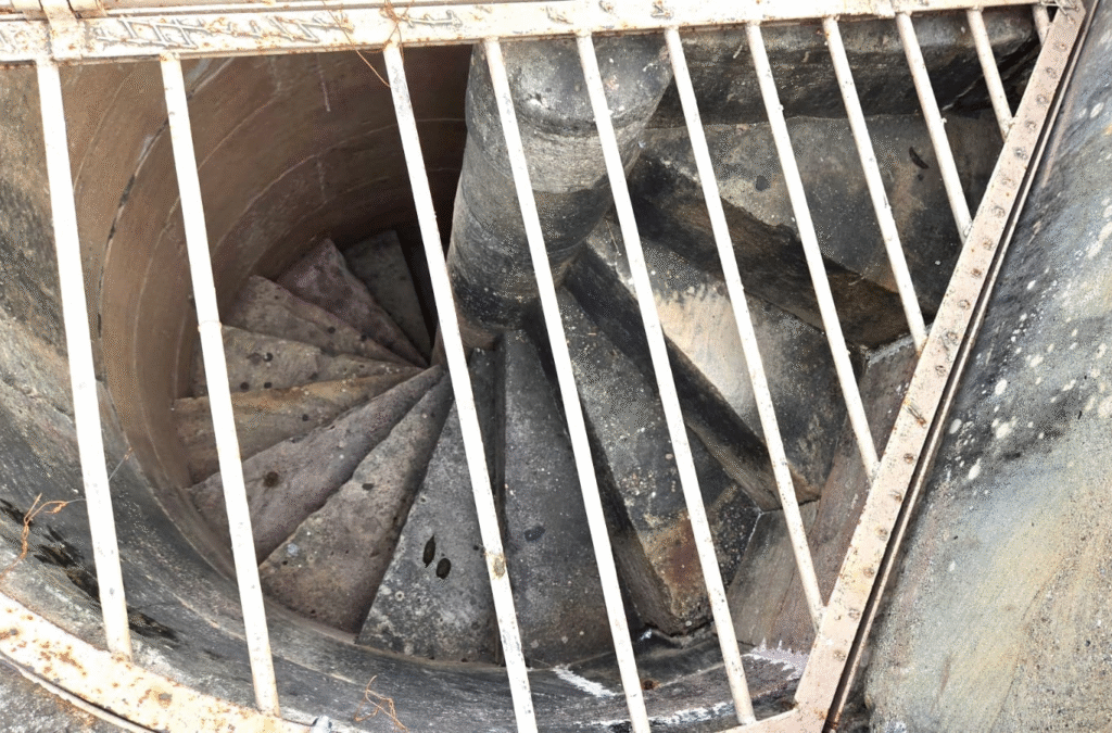कुंड के पास चौथे स्तर तक जाती घुमावदार सीढ़ियाँ