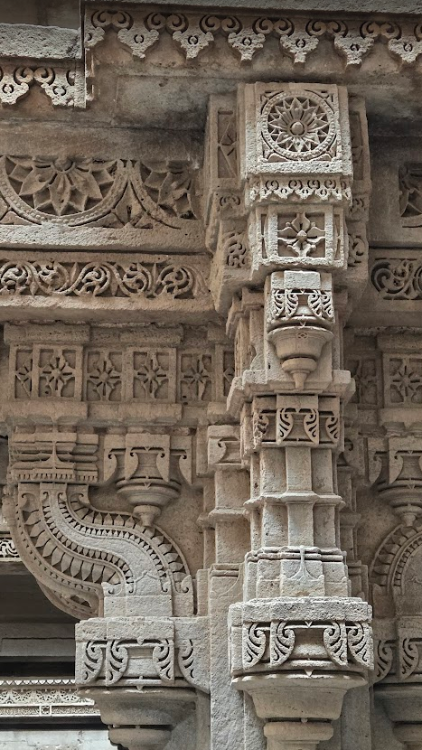 ज्यामितीय प्रतिरूपों और फूलों की नकाशी से सजे स्तम्भ